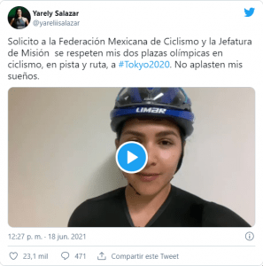 Apenas el jueves pasado, Yarely Salazar realizó un vídeo para pedir a la Federación Mexicana de Ciclismo y la Jefatura de Misión  que se respeten sus dos plazas olímpicas en ciclismo; pista y ruta, después de haber logrado el puntaje máximo para alcanzar dichos puestos.